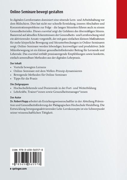In digitalen Lernformaten dominiert eine sitzende Lern- und Arbeitshaltung vor dem Bildschirm. Dies hat nicht nur schnelle Ermüdung, inneres Abschalten und Konzentrationsprobleme zur Folge - die langen Sitzzeiten führen auch zu einem Gesundheitsrisiko. Dieses essential zeigt die Gefahren des übermäßigen Sitzens. Basierend auf aktuellen Erkenntnissen der Gesundheits- und Lernforschung wird ein aktivierender Ansatz vorgestellt, der mit ganz einfachen kleinen Maßnahmen für mehr körperliche Bewegung und Sitzunterbrechungen in Online-Seminaren sorgt. Online-Seminare werden lebendiger, kurzweiliger und produktiver. Jede Mikrobewegung ist ein kleiner gesundheitsfördernder Beitrag für Lernende und Lehrende. Das essential enthält praxisanregende Empfehlungen sowie konkrete, einfach anwendbare Methoden aus der digitalen Lehrpraxis.