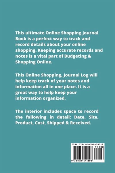 This Online Shopping notebook, organizer is a great way for tracking your online order/ orders. Whether for daily, monthly or weekly, it is simple and easy to use for recording all your online shopping activity. Makes a wonderful gift. Each inside page includes prompts sections and enough space to write: Date - Write the date of your purchase. Site - Log the website where you bought it. Product - Record the product, description, and who it's for. Cost - Write the price you paid. Shipped - Log when it shipped out. Received - Record when you received it. Makes a great organizer when you're tracking & budgeting your money for your online shopping purchase. Easily track your monthly spending activity. Perfect for Christmas lists, Birthday or anytime you buy a product online. Shopping design. Convenient large size of 6x9 inches, 108 pages, soft matte finish cover, quality white paper, black ink, paperback.