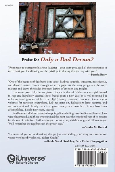 One of the youngest survivors of the Warsaw ghetto, author Sahbra Anna Markus lived a life only those who have survived Hitler's hell can imagine. In Only a Bad Dream? she narrates the drama of her early years through her most vivid memories. Sahbra courageously recounts those childhood experiences in her compelling voice, now freed from the repeated warnings: "Don't tell anyone you're a Jew." "Don't forget you're a Jew." "It was only a dream." "Hang on tight, or you'll get lost and die." She tells of traipsing through forests at night, fleeing certain death, of her parents hiding her in a church, desperate to save her life. A frantic search for surviving family found the Markuses traveling throughout Europe on foot, by rowboat, military train, farm wagon, trucks, and finally the ship Caserta that delivered them to the land of hope, freedom, and new beginnings-the only Jewish homeland, Israel. Only a Bad Dream ? shares how, in the midst of hunger and deprivation, Sahbra still found joy in simple things like cats, the moon, wolves, and fireflies. A story of the triumph of the human spirit, this memoir provides strong insight into the courage, strength, and dignity possessed by those who endured the Holocaust.
