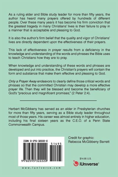 As a ruling elder and Bible study leader for more than fifty years, the author has heard many prayers offered by hundreds of different people. Over these many years it has become his firm conviction that the greatest tragedy in many Christians' lives is their failure to pray in a manner that is acceptable and pleasing to God. It is also the author's firm belief that the quality and vigor of Christians' lives are directly dependent upon the effectiveness of their prayers. This lack of effectiveness in prayer results from a deficiency in the knowledge and understanding of the words and phrases the Bible uses to teach Christians how they are to pray. When knowledge and understanding of these words and phrases are developed and put into practice, the Christian's prayers will contain the form and substance that make them effective and pleasing to God. Only a Prayer Away endeavors to clearly define those critical words and phrases so that the committed Christian may develop a more effective prayer life. Then they will be blessed and become the beneficiary of God's "precious and magnificent promises," (2 Peter 2:4).