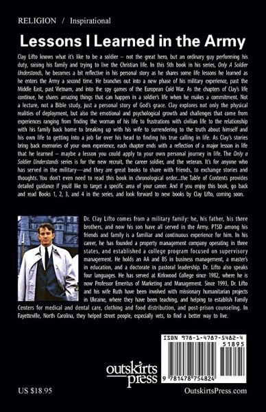 Clay Lifto knows what it's like to be a soldier - not the great hero, but an ordinary guy performing his duty, raising his family and trying to live the Christian life. In this 5th book in his series, Only A Soldier Understands, he becomes a bit reflective in his personal story as he shares some life lessons he learned as he enters the Army a second time. He branches out into a new phase of his military experience, past the Middle East, past Vietnam, and into the spy games of the European Cold War. As the chapters of Clay's life continue, he shares amazing things that can happen in a soldier's life when he makes a commitment. Not a lecture, not a Bible study, just a personal story of God's grace. Clay explores not only the physical realities of deployment, but also the emotional and psychological growth and challenges that come from experiences ranging from finding the woman of his life to frustrations with civilian life to the relationship with his family back home to breaking up with his wife to surrendering to the truth about himself and his own life to getting into a job far over his head to finding his true calling in life. As Clay's stories bring back memories of your own experience, each chapter ends with a reflection of a major lesson in life that he learned - maybe a lesson you could apply to your own personal journey in life. The Only a Soldier Understands series is for the new recruit, the career soldier, and the veteran. It's for anyone who has served in the military-and they are great books to share with friends, to exchange stories and thoughts. You don't even need to read this book in chronological order...the Table of Contents provides detailed guidance if you'd like to target a specific area of your career. And if you enjoy this book, go back and read Books 1, 2, 3, and 4 in the series, and look forward to new books by Clay Lifto, coming soon.