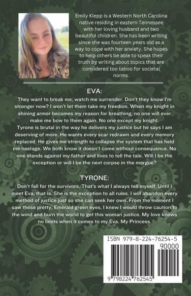 Eva: They want to break me, watch me surrender. Don't they know I'm stronger now? I won't let them take my freedom. When my knight in shining armor becomes my reason for breathing, no one will ever make me bow to them again. No one except my knight. Tyrone is brutal in the way he delivers my justice but he says I am deserving of more. He wants every scar redrawn and every memory replaced. He gives me strength to collapse the system that has held me hostage. We both know it doesn't come without consequence. No one stands against my father and lives to tell the tale. Will I be the exception or will I be the next corpse in the morgue? Tyrone: Don't fall for the survivors. That's what I always tell myself. Until I meet Eva, that is. She is the exception to all rules. I will abandon every method of justice just so she can seek her own. From the moment I saw those pretty, Emerald green eyes, I knew I would throw caution to the wind and burn the world to get this woman justice. My love knows no limits when it comes to my Eva. My Princess.