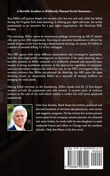 Only Ann Knows A Horrible Accident or Brilliantly Planned Social Statement Ann Miller still grieves deeply five months after her son and only child was killed during the Virginia Tech mass shooting. A lifelong gun rights advocate, she works passionately as an executive for a gun rights organization, the American Rifle Society. One morning, Miller opens an anonymous package containing an AK-47 assault rifle sent to her ARS department. Entering an executive boardroom to deliver the assault weapon to her boss during a departmental meeting, she sprays 50 bullets in a matter of seconds killing 13 of her colleagues. Two FBI agents with vastly different personalities and investigative approaches lead the ultra-high-profile investigation to determine if the mass shooting was a horrible accident as Miller contends or a brilliantly planned and executed mass murder to bring worldwide attention to the destructive capability of automatic and semi-automatic weapons like killed her son. As the FBI's investigation fails to uncover evidence that Miller pre-planned the shooting, the ARS spins the mass shooting events to characterize Miller as a mentally ill woman hellbent on avenging her son's death. Having killed everyone in the boardroom, Miller stands trial for 13 first-degree murders as both the perpetrator and only witness. A surprise piece of evidence surfaces at the end of the trial which renders a verdict but still leaves questions unanswered.