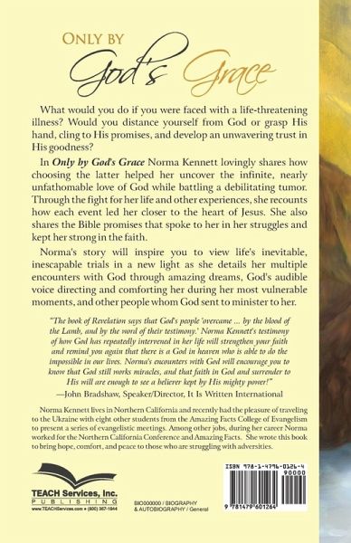 What would you do if you were faced with a life-threatening illness? Would you distance yourself from God or grasp His hand, cling to His promises, and develop an unwavering trust in His goodness? In Only by God's Grace Norma Kennett lovingly shares how choosing the latter helped her uncover the infinite, nearly unfathomable love of God while battling a debilitating tumor. Through the fight for her life and other experiences, she recounts how each event led her closer to the heart of Jesus. She also shares the Bible promises that spoke to her in her struggles and kept her strong in the faith. Norma's story will inspire you to view life's inevitable, inescapable trials in a new light as she details her multiple encounters with God through amazing dreams, God's audible voice directing and comforting her during her most vulnerable moments, and other people whom God sent to minister to her. "The book of Revelation says that God's people 'overcame ... by the blood of the Lamb, and by the word of their testimony.' Norma Kennett's testimony of how God has repeatedly intervened in her life will strengthen your faith and remind you again that there is a God in heaven who is able to do the impossible in our lives. Norma's encounters with God will encourage you to know that God still works miracles, and that faith in God and surrender to His will are enough to see a believer kept by His mighty power!"-John Bradshaw, Speaker/Director, It Is Written International