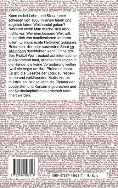 Kann es bei Lohn- und Steuerunterschieden von 1000 % einen freien und zugleich fairen Welthandel geben? Natürlich nicht! Man mache sich also nichts vor: Wer eine bessere Welt will, muss sich von manifestierten Irrlehren lösen. Er muss echte Reformen zulassen. Reformen, die jeder souveräne Staat im Alleingang durchführen kann. Ohne großes Risiko! Wer treudoof auf internationale Abkommen baut, arbeitet denjenigen in die Hände, die keine Veränderung wollen (weil sie Angst um ihre Pfründe haben). Es gilt, die Gesetze der Logik zu respektieren und verklärenden Statistiken zu misstrauen. Nur so kann die Diktatur der Lobbyisten und Konzerne gebrochen und der Kasinokapitalismus ernsthaft reformiert werden.