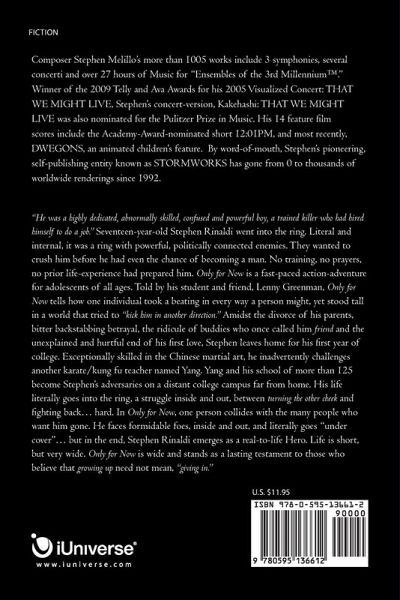 Seventeen-year-old Stephen Rinaldi was a highly dedicated, abnormally skilled, confused and powerful boy on the precipice of manhood. He was a proficient killer who had hired himself to crush a wrong. Literal and internal, Stephen stepped into a ring with powerful, politically connected enemies. No training, no prayers, no prior life-experience had prepared him. Told by his student and friend, Lenny Greenman, Only for Now s a fast-paced action-adventure that recounts how one individual took a beating in every way a person might, yet stood tall in a world that tried to kick him in another direction. During the divorce of his parents, bitter backstabbing betrayals, the ridicule of buddies who once called him a friend and the unexplained and hurtful end of his first love, Stephen leaves home for his first year at college. Exceptionally skilled in the Chinese martial art, he inadvertently challenges another kung fu teacher named Yang. Frank Yang and his school of more than 125 become adversaries on a distant college campus far from home. Stephen's life literally goes into a ring, a struggle inside and out, between turning the other cheek and fighting back… hard. In Only for Now, one person collides with formidable foes and literally goes undercover, but in the end, Stephen Rinaldi emerges as a real-to-life Hero. Life is short but wide. Only for Now stands as a lasting testament to those who believe that growing up need not mean giving in.