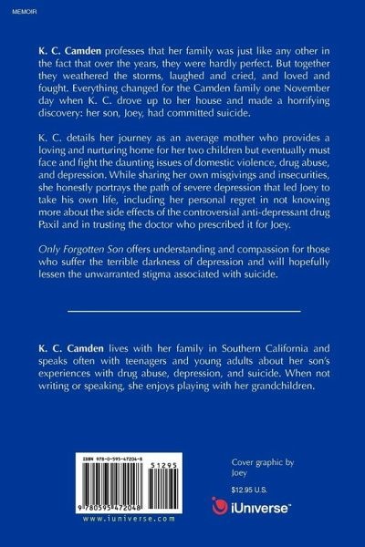 K. C. Camden professes that her family was just like any other in the fact that over the years, they were hardly perfect. But together they weathered the storms, laughed and cried, and loved and fought. Everything changed for the Camden family one November day when K. C. drove up to her house and made a horrifying discovery: her son, Joey, had committed suicide. K. C. details her journey as an average mother who provides a loving and nurturing home for her two children but eventually must face and fight the daunting issues of domestic violence, drug abuse, and depression. While sharing her own misgivings and insecurities, she honestly portrays the path of severe depression that led Joey to take his own life, including her personal regret in not knowing more about the side effects of the controversial anti-depressant drug Paxil and in trusting the doctor who prescribed it for Joey. Only Forgotten Son offers understanding and compassion for those who suffer the terrible darkness of depression and will hopefully lessen the unwarranted stigma associated with suicide.