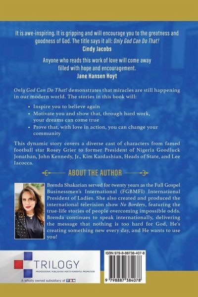 It is awe-inspiring. It is gripping and will encourage you to the greatness and goodness of God. The title says it all: Only God Can Do That! - Cindy Jacobs Anyone who reads this work of love will come away filled with hope and encouragement. -Jane Hansen Hoyt Only God Can Do That! demonstrates that miracles are still happening in our modern world. The stories in this book will:Inspire you to believe again Motivate you and show that, through hard work, your dreams can come true Prove that, with love in action, you can change your community This dynamic story covers a diverse cast of characters from famed football star Rosey Grier to former President of Nigeria Goodluck Jonathan, John Kennedy, Jr., Kim Kardashian, Heads of State, and Lee Iacocca.