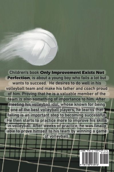 Children's book Only Improvement Exists Not Perfection, is about a young boy who fails a lot but wants to succeed. He desires to do well in his volleyball team and make his father and coach proud of him. Proving that he is a valuable member of the team is also something of importance to him. After meeting his volleyball idol, whose known for being one of the best volleyball players, he learns that failing is an important step to becoming successful. He then starts to practice more to improve his skills in volleyball. After weeks of practice, he was finally able to prove himself to his team by winning a game of volleyball.…mehr