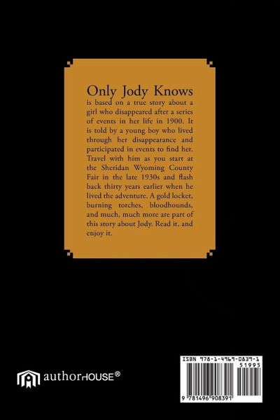 Only Jody Knows is based on a true story about a girl who disappeared after a series of events in her life in 1900. It is told by a young boy who lived through her disappearance and participated in events to find her. Travel with him as you start at the Sheridan Wyoming County Fair in the late 1930s and flashback thirty years earlier when he lived the adventure. A gold locket, burning torches, bloodhounds, and much, much more are part of this story about Jody. Read it, and enjoy it.