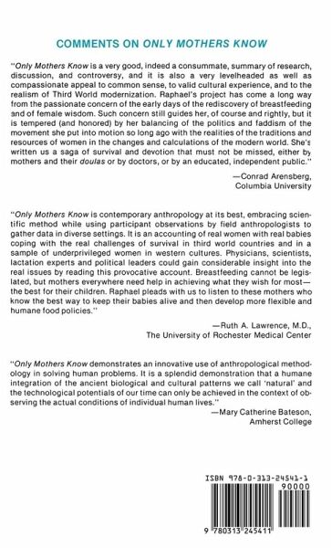 Only Mothers Know is a very good, indeed a consummate, summary of research, discussion, and controversy, and it is also a very levelheaded as well as compassionate appeal to common sense, to valid cultural experience, and to the realism of Third World modernization. Raphael's project has come a long way from the passionate concern of the early days of the rediscovery of breastfeeding and of female wisdom. Such concern still guides her, of course and righly, but it is tempered (and honored) by her balancing of the politics and faddism of the movement she put into motion so long ago with the realities of the traditions and resources of women in the changes and the calculations of the modern world. She's written us a saga of survival and devotion that must not be missed, either by mothers and their doulas or by doctors, or by an educated, independent public. Conrad Arensberg, Columbia University