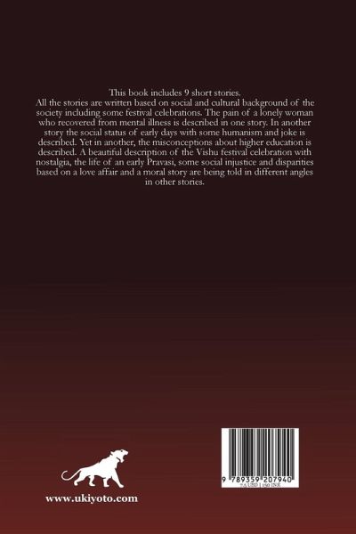 This book includes 9 short stories. All the stories are written based on social and cultural background of the society including some festival celebrations. The pain of a lonely woman who recovered from mental illness is described in one story. In another story the social status of early days with some humanism and joke is described. Yet in another, the misconceptions about higher education is described. A beautiful description of the Vishu festival celebration with nostalgia, the life of an early Pravasi, some social injustice and disparities based on a love affair and a moral story are being told in different angles in other stories.