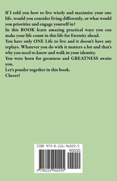 If I told you how to live wisely and maximize your one life, would you consider living differently, or what would you prioritize and engage yourself in? In this BOOK learn amazing practical ways you can make your life count in this life for Eternity ahead. You have only ONE Life to live and it doesn't have any replays. Whatever you do with it matters a lot and that's why you need to know and walk in your identity. You were born for greatness and GREATNESS awaits you. Let's ponder together in this book. Cheers!