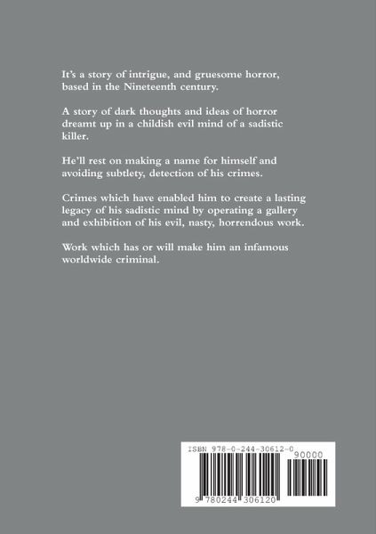 It's a story of intrigue, and gruesome horror, based in the Nineteenth century. A story of dark thoughts and ideas of horror dreamt up in a childish evil mind of a sadistic killer. He'll rest on making a name for himself and avoiding subtlety, detection of his crimes. Crimes which have enabled him to create a lasting legacy of his sadistic mind by operating a gallery and exhibition of his evil, nasty, horrendous work. Work which has or will make him an infamous worldwide criminal.