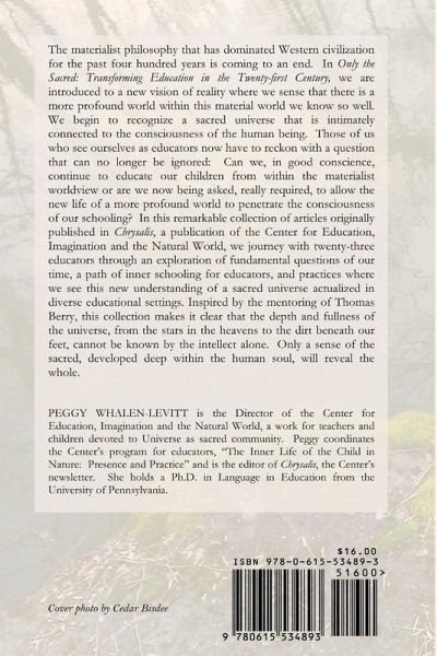 The materialist philosophy that has dominated Western civilization for the past four hundred years is coming to an end. In "Only the Sacred: Transforming Education in the Twenty-first Century," we are introduced to a new vision of reality where we sense a more profound world within the material world we know so well. In this remarkable collection of articles originally published in "Chrysalis," a publication of the Center for Education, Imagination and the Natural World, we journey with twenty-three educators through an exploration of fundamental questions of our time, a path of inner schooling for educators, and practices where a new understanding of a sacred universe is actualized in diverse educational settings. Inspired by the mentoring of Thomas Berry, this collection makes it clear that the depth and fullness of the universe, from the stars in the heavens to the dirt beneath our feet, cannot be known by the intellect alone. Only a sense of the sacred, deep within the human soul, will reveal the whole.