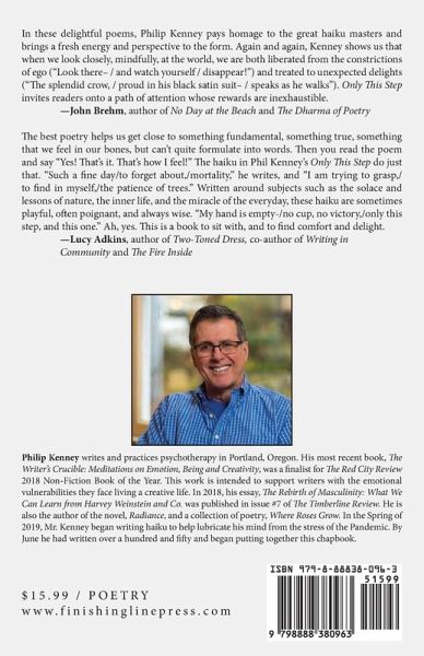 With subtlety and directness these haiku illuminate again and again the astonishing realities of the world and consciousness itself. Whether in the yearning of a windchime, or the hunger to realize the patience of a tree readers of Only This Step will find that these poems open the mind to new ways of seeing and experiencing. In an introductory essay to haiku, former United States Poet Laureate, Billy Collins wrote this about the nature of this form: ". . . flat definitions fall well short of accounting for haiku's mysterious power to cause in the reader's consciousness a sudden shift, literally a new way of seeing." Philip Kenney's haiku in Only This Step fulfill the nature of that promise.