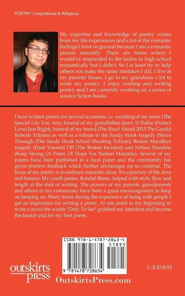Get ready for an exciting romantic filled adventure of poetry that will fill your minds with what true romanticism can be. I have written poems for several occasions; i.e. wedding of my sister "The Special Lily You Are", funeral of my grandfather (Jerry D Dobie) "Perfect Love (Just Right)", funeral of my friend(Gerald Roberts) "The Road Ahead (The Gerald Roberts Tribute)" as well as a tribute to the Sandy Hook tragedy "Strive Through (The Sandy Hook School Shooting Tribute)", Boston Marathon tragedy (Dust Yourself Off (The Boston Incident) and (Nelson Mandela) "Keep Strong (A Poem Of Hope For Nelson Mandela)". Several of my poems have been published in the hometown paper and people throughout the community have given positive feedback which further encouraged me to continue. There are some poems in here that are targeted for lifting others up when they need it most. The focus of my poetry is to embrace romantic ideals. It's a journey of life, love and lessons. My youth pastor, Kendal Sheen, helped with the style, flow and length at the start of writing. The prayers of my parents, grandparents and others in my community have been a great encouragement to keep on keeping on. Many times during the experience of being with people I get an inspiration for writing a poem. At the very beginning of writing poetry, while I was writing a novel, the words "Only To See" grabbed my attention and became the launch pad for my first poem. Also, music from the bands, Journey, Richard Marx, The Outfield, and so many others have inspired my poetry writings. Matter of fact, I had started writing the poems as lyrics for possibly being used in songs. There may be a special moment in your life where you need a poem to help with a certain life situation when words fail you. Then there is the time of engagement. That special time where you remind your loved one that you still are in love with them. My poetry will reinvigorate that in both of your minds and those around you. Then there
