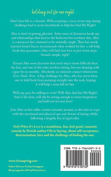 Alex is tired of being single. After years of disastrous hook-ups and relationships that lead to the bedroom but nowhere else, Alex is convinced she'll never find her Mr Right. Then her newly married friend Stacey recommends what worked for her: a self-help book that guarantees Alex will find true love in just seven steps. Sounds simple, right? Except Alex soon discovers that each step is more difficult than the last, and one of the rules involves dating, but not sleeping with a guy for six months. Absolutely no intimate contact whatsoever. Zero. Nada. Rien. A big challenge for Alex, who has never been one to hold back from jumping straight into the sack, hoping it will help a man fall for her. Will any guys be willing to wait? Will Alex find her Mr Right? And if she does, will she be strong enough to resist temptation and hold out for true love? Join Alex on her roller coaster romantic journey as she tries to cope with the emotional and physical ups and downs of dating whilst following a lengthy list of rigid rules. Only When It's Love is a fun, feel-good, romantic comedy by British author Olivia Spring, about self-acceptance, determination, love and the challenge of finding the one. The sequel, When's the Wedding? is available now.