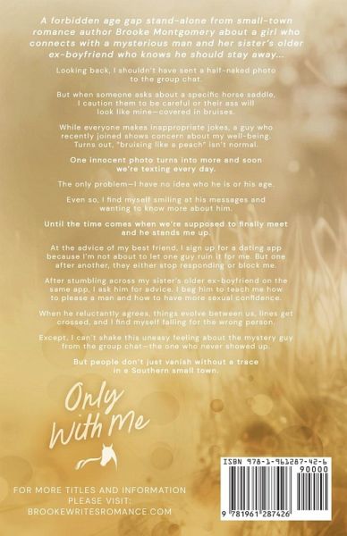 A forbidden age gap stand-alone from small-town romance author Brooke Montgomery about a girl who connects with a mysterious man and her sister's older ex-boyfriend who knows he should stay away... Looking back, I shouldn't have sent a half-naked photo to the group chat. But when someone asks about a specific horse saddle, I caution them to be careful or their ass will look like mine-covered in bruises. While everyone makes inappropriate jokes, a guy who recently joined shows concern about my well-being. Turns out, "bruising like a peach" isn't normal. One innocent photo turns into more and soon we're texting every day. The only problem-I have no idea who he is or his age. Even so, I find myself smiling at his messages and wanting to know more about him. Until the time comes when we're supposed to finally meet and he stands me up. At the advice of my best friend, I sign up for a dating app because I'm not about to let one guy ruin it for me. But one after another, they either stop responding or block me. After stumbling across my sister's older ex-boyfriend on the same app, I ask him for advice. I beg him to teach me how to please a man and how to have more sexual confidence. When he reluctantly agrees, things evolve between us, lines get crossed, and I find myself falling for the wrong person. Except, I can't shake this uneasy feeling about the mystery guy from the group chat-the one who never showed up. But people don't just vanish without a trace in a Southern small town. Only With Me is book 4 in the Sugarland Creek series. Each book in this Southern, small town series is a stand-alone and ends in a happily ever after.