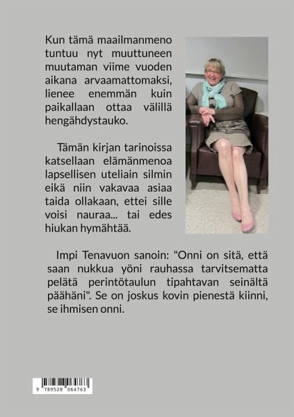 Kun tämä maailmanmeno tuntuu muuttuneen muutaman viime vuoden aikana arvaamattomaksi, lienee enemmän kuin paikallaan ottaa välillä hengähdystauko. Tämän kirjan tarinoissa katsellaan elämänmenoa lapsellisen uteliain silmin eikä niin vakavaa asiaa taida ollakaan, ettei sille voisi nauraa... tai edes hiukan hymähtää. Impi Tenavuon sanoin: "Onni on sitä, että saa nukkua yönsä rauhassa tarvitsematta pelätä perintötaulun tipahtavan seinältä päähän". Se on joskus pienestä kiinni, se ihmisen onni.