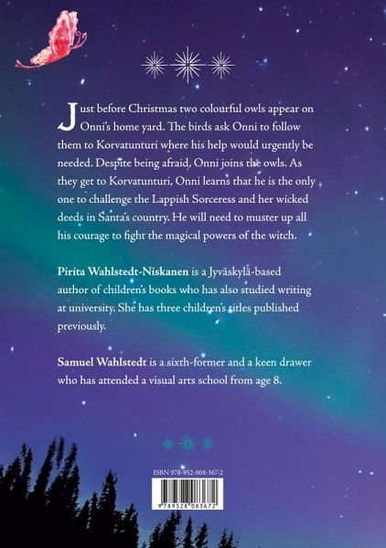 Just before Christmas two colourful owls appear on Onni's home yard. The birds ask Onni to follow them to Korvatunturi where his help would urgently be needed. Despite being afraid, Onni joins the owls. As they get to Korvatunturi, Onni learns that he is the only one to challenge the Lappish Sorceress and her wicked deeds in Santa's country. He will need to muster up all his courage to fight the magical powers of the witch. Onni and the Spell of the Lappish Sorceress is a winter adventure story that takes place in the land of Santa Claus. The story has magical powers, fairytale characters and a northern feel.