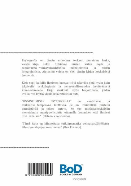Psykografia on tämän erikoisen teoksen punainen lanka. Psykografian ydin on ymmärtää paremmin itseään ja muita. Kirja on tutkielma uusista kuten myös jo tunnetuista voimavaralähtöisistä menetelmistä ja niiden integroinnista. Ajatusten voima on yksi tämän kirjan keskeisistä teemoista. Kirja sopii kaikille ihmisten kanssa työtä tekeville yhtä hyvin kuin jokaiselle psykologiasta ja persoonallisuuuden kehityksestä kiinnostuneelle. Kirja sisältää myös harjoituksia, joiden avulla voi löytää yksilöllisiä ratkaisun teitä. "ONNISTUMISEN PSYKOLOGIAA" on nautittavaa mukaansa tempaavaa luettavaa. Se on inhimillisiä piirteitä ymmärtävä ja toivoa antava. Se tuo ratkaisukeskeisiin menetelmiin monipuolisuutta ottamalla huomioon että ihmiset ovat erilaisia." (Helena Vuoriheimo) "Tämä kirja on kiinnostava tutkimusmatka voimavaralähtöisten lähestymistapojen maailmaan." (Ben Furman)