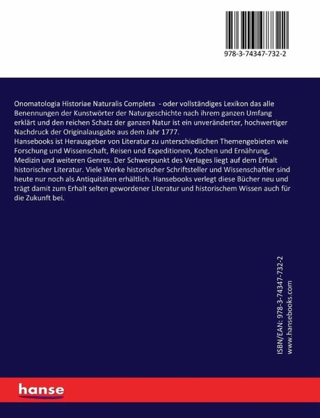 Onomatologia Historiae Naturalis Completa - oder vollständiges Lexikon das alle Benennungen der Kunstwörter der Naturgeschichte nach ihrem ganzen Umfang erklärt und den reichen Schatz der ganzen Natur ist ein unveränderter, hochwertiger Nachdruck der Originalausgabe aus dem Jahr 1777.