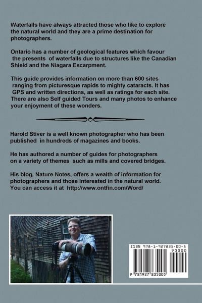 A Source book for Travelers, Photographers, Explorers... A Complete Guide to Ontario Waterfalls Descriptions of over 600 waterfall sites in Ontario GPS Positions Written Driving Directions Basic Info for each Site Photo Tips for major Sites Types of waterfalls Included are Self-Guided Tours for some of the major waterfall areas throughout the province. Agawa Canyon Train Tour Niagara Region Tour Hamilton Premier Tour Hamilton Chedoke Rail Tour Owen Sound Tour Bracebridge Tour Haliburton Tour The Bonnechere River Tour Northeast Tour Thunder Bay Tour