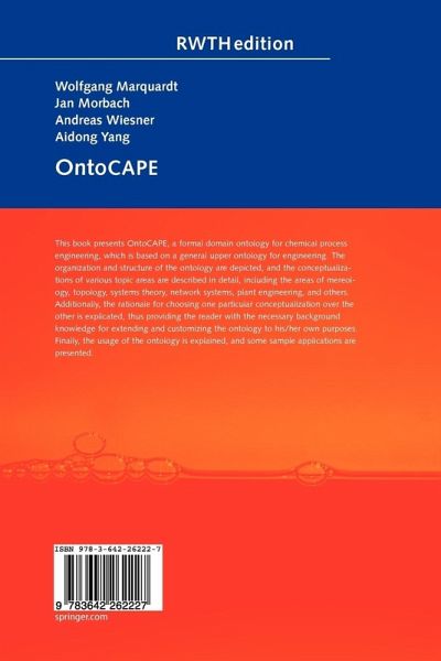 Preface.- Introduction.- Scientific Background.- Overview on OntoCAPE.- Meta Model.- Upper Level.- Supporting Concepts.- Material.- Chemical Process Systems.- Mathematical Models.- Design Principles of OntoCAPE.- Related Work on Ontologies for Engineering Applications.- Evolutionary Improvement and Validation through Applications.- Conclusions.- Bibliography.- Index.- Index of Concept Descriptions.