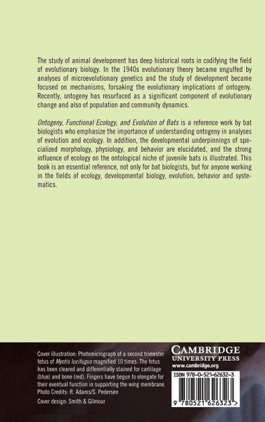 The study of animal development has deep historical roots in codifying the field of evolutionary biology. In the 1940s evolutionary theory became engulfed by analyses of microevolutionary genetics and development became focused on mechanisms, forsaking the evolutionary implications of ontogeny. Recently, ontogeny has resurfaced as a significant component of evolutionary change and also of population and community dynamics. Ontogeny, Functional Ecology and Evolution of Bats is a reference work by bat biologists who emphasize the importance of understanding ontogeny in analyses of evolution and ecology. In addition, the developmental underpinnings of specialized morphology, physiology and behaviour are elucidated, and the strong influence of ecology on the ontological niche of juvenile bats is illustrated. This book is an essential reference, not only for bat biologists, but for anyone working in the fields of ecology, developmental biology, evolution, behaviour and systematics.