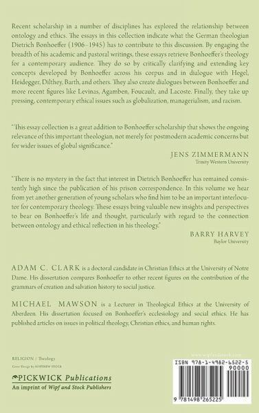 Description: Recent scholarship in a number of disciplines has explored the relationship between ontology and ethics. The essays in this collection indicate what the German theologian Dietrich Bonhoeffer (1906-1945) has to contribute to this discussion. By engaging the breadth of his academic and pastoral writings, these essays retrieve Bonhoeffer's theology for a contemporary audience. They do so by critically clarifying and extending key concepts developed by Bonhoeffer across his corpus and in dialogue with Hegel, Heidegger, Dilthey, Barth, and others. They also create dialogues between Bonhoeffer and more recent figures like Levinas, Agamben, Foucault, and Lacoste. Finally, they take up pressing, contemporary ethical issues such as globalization, managerialism, and racism.