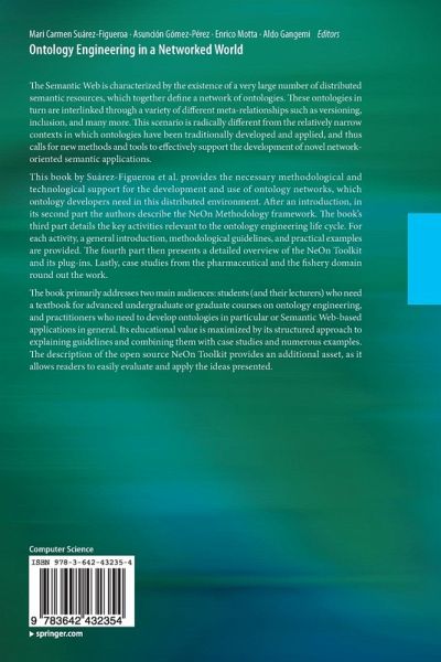 This book by Suárez-Figueroa et al. provides the necessary methodological and technological support for the development and use of ontology networks, which ontology developers need in this distributed environment. After an introduction, in its second part the authors describe the NeOn Methodology framework. The book's third part details the key activities relevant to the ontology engineering life cycle. For each activity, a general introduction, methodological guidelines, and practical examples are provided. The fourth part then presents a detailed overview of the NeOn Toolkit and its plug-ins. Lastly, case studies from the pharmaceutical and the fishery domain round out the work.