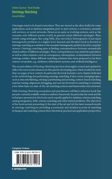 The second edition of Ontology Matching has been thoroughly revised and updated to reflect the most recent advances in this quickly developing area, which resulted in more than 150 pages of new content. In particular, the book includes a new chapter dedicated to the methodology for performing ontology matching. It also covers emerging topics, such as data interlinking, ontology partitioning and pruning, context-based matching, matcher tuning, alignment debugging, and user involvement in matching, to mention a few. More than 100 state-of-the-art matching systems and frameworks were reviewed.