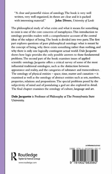The philosophical study of what exists and what it means for something to exist is one of the core concerns of metaphysics. This introduction to ontology provides readers with a comprehensive account of the central ideas of the subject of being. This book is divided into two parts. The first part explores questions of pure philosophical ontology: what is meant by the concept of being, why there exists something rather than nothing, and why there is only one logically contingent actual world. Dale Jacquette shows how logic provides the only possible answers to these fundamental problems. The second part of this book examines issues of applied scientific ontology. Jacquette offers a critical survey of some of the most influential traditional ontologies, such as the distinction between appearance and reality, and the categories of substance and transcendence. The ontology of physical entities - space, time, matter and causation - is examined as well as the ontology of abstract entities such as sets, numbers, properties, relations and propositions. The special problems posed by the subjectivity of mind and of postulating a god are also explored in detail. The final chapter examines the ontology of culture, language and art.