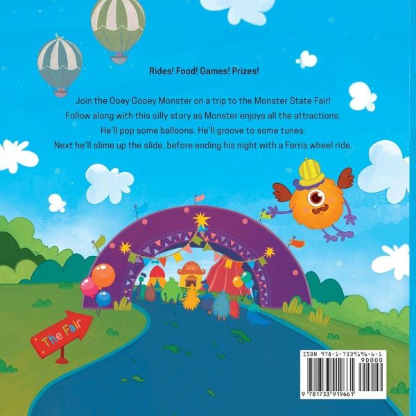 Rides! Food! Games! Prizes! Join the Ooey Gooey Monster on a silly, slimy trip to the Monster State Fair! Follow along as Monster enjoys all the attractions. He'll pop some balloons. He'll groove to some tunes. Next he'll slime up the slide, before ending his night with a Ferris wheel ride. This lighthearted story with bouncy rhymes is fun for any child, and the colorful illustrations are sure to grab the attention of even the youngest readers.