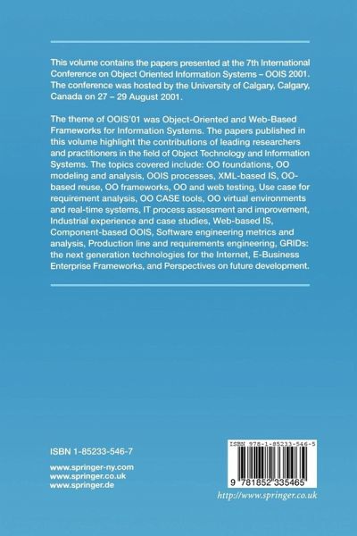 Welcome to 00lS'01 and Calgary! This is the 7th International Conference on Object-Oriented Information Systems (OOlS) that focus on Object-Oriented and Web-Based Frameworks for Information Systems. In the last few years we've seen significant new development in this field, from one-off design technologies to reusable frameworks, and from web applications to bioinformatic systems. We perceive that information processing is one of the most important activities of human beings. Object-orientation and frameworks have been the main-stream technologies for design and implementation of large-scale and complex information systems. Recent research advances and industrial innovations in information systems modeling and Internet applications have explored the new trends in shifting information system vendors from component and system developers to services providers. Users of information systems are increasingly demanding higher performance, mobility, and personalization in order to realize the dream to access and obtain necessary information anywhere and anytime. The new development requires the investigation of new architectures, frameworks, processes, and inter-connectivity of information systems at society, organization, team, and personal levels. The 00lS'01 Proceedings has put together a program of 53 papers from leading researchers and practitioners in the field of object technology and information systems.