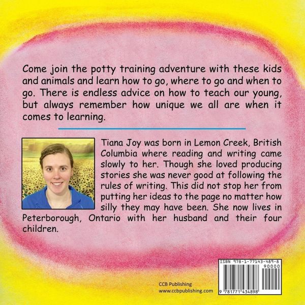 Come join the potty training adventure with these kids and animals and learn how to go, where to go and when to go. There is endless advice on how to teach our young, but always remember how unique we all are when it comes to learning. About the Author: Tiana Joy was born in Lemon Creek, British Columbia where reading and writing came slowly to her. Though she loved producing stories she was never good at following the rules of writing. This did not stop her from putting her ideas to the page no matter how silly they may have been. She now lives in Peterborough, Ontario with her husband and their four children.