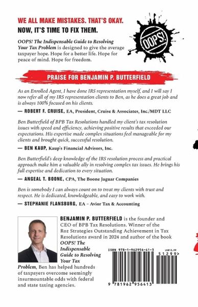 WE ALL MAKE MISTAKES. THAT'S OKAY. NOW, IT'S TIME TO FIX THEM. OOPS! The Indispensable Guide to Resolving Your Tax Problem is designed to give the average taxpayer hope. Hope for a better life. Hope for peace of mind. Hope for freedom. Are you overwhelmed by tax debt? Struggling to navigate the confusing maze of IRS regulations? Tax resolution specialist Ben Butterfield is here to help-and he's pulling back the curtain in his brand-new book, OOPS! This powerful guide simplifies complex tax concepts, breaking them down into a groundbreaking, easy-to-understand format. Ben has been hard at work distilling years of tax resolution experience into a book that gives you clear, actionable strategies to tackle your tax debt head-on. With OOPS!, you'll get a clear picture of how to take control of your financial future. What You'll Learn in OOPS! Ben doesn't just explain the problem; he gives you the roadmap to solve it. Here's a sneak peek of what's inside:How to negotiate with the IRS like a pro and reduce your debt. Common tax pitfalls (and how to avoid them). The secrets behind IRS policies that they don't want you to know. Step-by-step strategies for tackling tax debt in ways that work for YOU. Real-world examples and case studies that explain even the most complicated concepts in plain English. Ben's mission is simple: to empower you with expert knowledge, presented in a way that's clear, relatable, and easy to understand, so you can navigate tax relief with confidence. The Book the IRS Doesn't Want You to Read... Tax debt is a heavy burden, but Ben believes everyone deserves a fresh start. With over a decade of experience in tax resolution, he's helped countless people just like you resolve their IRS issues and regain financial freedom. Now, he's sharing his proven techniques in a straightforward, reader-friendly book. This is your chance to turn your "OOPS!" into an opportunity. Let Ben guide you to a future free from tax debt stress-one simple, clear explanation at a time.