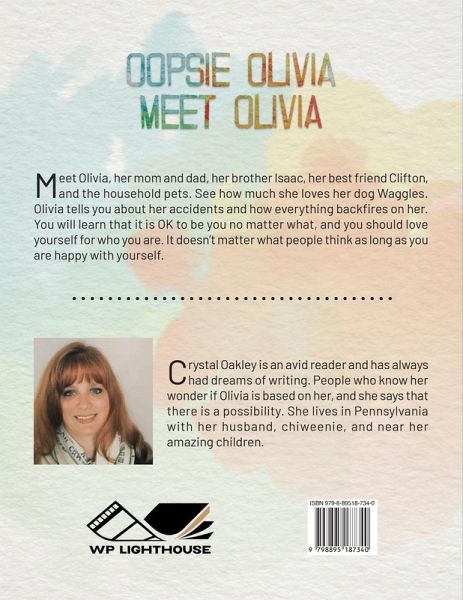 Meet Olivia, her mom and dad, her brother Isaac, her best friend Clifton, and the household pets. See how much she loves her dog, Waggles. Olivia tells you about her accidents and how everything backfires on her. You will learn that it is OK to be yourself, no matter what, and that you should love yourself for who you are. It doesn't matter what people think as long as you are happy with yourself.