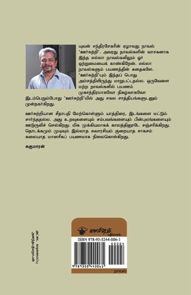 This is Yuvan Chandrasekar's seventh novel. A reader familiar with Yuvan's body of work would be able to identify a similarity on all his novels - that all of them are travel stories. 'Oorsutri' (Wanderer) is not an exception to that. But where travel happens in other stories as an event or with a movie, here all the possibilities are explored. The journey that the wanderer Seethapathi undergoes is not merely one of geographical locations, but of relationships, incidents and backgrounds. More important, it is through time. This is a journey without beginning or end, but entirely captivating and no less of an adventures.