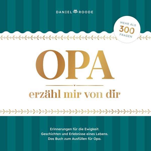 Bewahre Opas Leben für immer - ein Geschenk für kommende Generationen: Großväter haben in ihrem Leben viel erlebt, gelernt und einzigartige Erfahrungen gesammelt. Dieses Buch führt sie durch spannende Fragen, um die Momente festzuhalten, die ihr Leben ausgemacht haben. Es ist eine wunderbare Möglichkeit, die Erinnerungen von Opa zu bewahren und den jüngeren Generationen einen Einblick in die Vergangenheit zu geben. So können sie von den Weisheiten und Lektionen lernen, die Opa im Laufe seines Lebens gesammelt hat. So hilft es deinem Opa:Es ist nicht immer leicht, sich an alle Ereignisse eines ganzen Lebens zu erinnern. Doch dieses Buch macht es durch gezielte Fragen und Denkanregungen einfacher, die eigenen Memoiren festzuhalten und mit der Familie zu teilen. Es ist das ideale Geschenk für jeden Großvater. Einfaches Erinnern durch Fragen und Denkanstöße: Das Buch ist in verschiedene Kapitel und Themenbereiche gegliedert, die persönliche Erlebnisse, schulischen und beruflichen Werdegang, Beziehungen, Reflexionen, Ansichten und vieles mehr umfassen. Ein zeitloses Andenken für die nächsten Generationen!