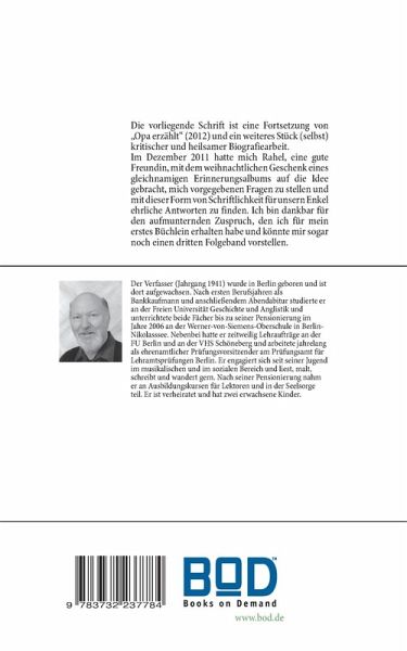 Die vorliegende Schrift ist eine Fortsetzung von "Opa erzählt" (2012) und ein weiteres Stück (selbst)kritischer und heilsamer Biografiearbeit.Im Dezember 2011 hatte mich Rahel, eine gute Freundin, mit dem weihnachtlichen Geschenk eines gleichnamigen Erinnerungsalbums auf die Idee gebracht, mich vorgegebenen Fragen zu stellen und mit dieser Form von Schriftlichkeit für unsern Enkel ehrliche Antworten zu finden. Ich bin dankbar für den aufmunternden Zuspruch, den ich für mein erstes Büchlein erhalten habe und könnte mir sogar noch einen dritten Folgeband vorstellen.