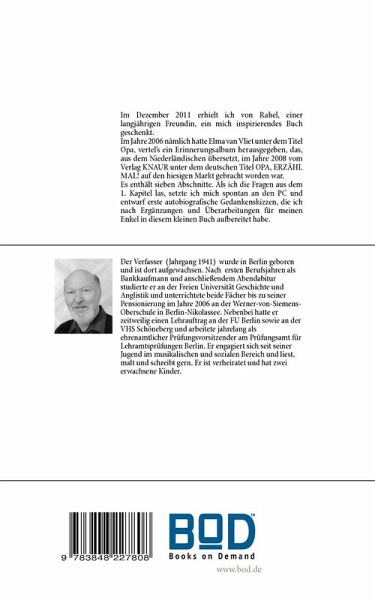 Im Dezember 2011 erhielt ich von Rahel, einer langjährigen Freundin, ein mich inspirierendes Buch geschenkt.Im Jahre 2006 nämlich hatte Elma van Vliet unter dem Titel Opa, vertel's ein Erinnerungsalbum herausgegeben, das, aus dem Niederländischen übersetzt, im Jahre 2008 vom Verlag KNAUR unter dem deutschen Titel OPA, ERZÄHL MAL! auf den hiesigen Markt gebracht worden war.Es enthält sieben Abschnitte. Als ich die Fragen aus dem 1. Kapitel las, setzte ich mich spontan an den PC und entwarf erste autobiografische Gedankenskizzen, die ich nach Ergänzungen und Überarbeitungen für meinen Enkel in diesem kleinen Buch aufbereitet habe.
