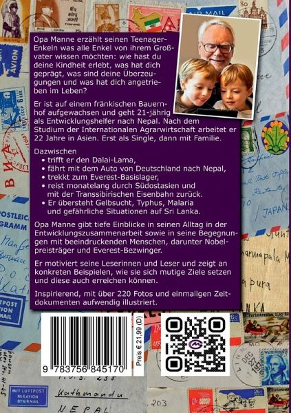 "Opa Manne, bist du wirklich mit dem Auto von Deutschland nach Nepal gefahren?" Opa Manne kann auf einen außergewöhnlichen Lebensweg zurückblicken. Seine Teenager-Enkel sind fasziniert von seinen Abenteuern. Sie wollen aber auch verstehen warum er diesen Weg gewählt hat und stellen die Fragen, die alle Enkel an ihren Großvater stellen: Wie hast du deine Kindheit erlebt, was hat dich geprägt, was sind deine Überzeugungen und was hat dich angetrieben im Leben?Er schildert in dieser Autobiografie, wie er seine entbehrungsreiche Kindheit in den 1950er- und 1960er-Jahren auf dem zukunftslosen elterlichen Bauernhof erlebte, was ihn anspornte, seinen Weg zu gehen, und was ihm wichtig war im Leben. Er erzählt nicht nur von seinen Abenteuern in Asien, sondern auch von seinen Überzeugungen, Gedanken und Gefühlen, die ihn all die Jahre begleitet und geleitet haben. Und er redet über all das, was er so gerne von seinen eigenen Großeltern erfahren hätte. Schon als 21-Jähriger geht er 1970 alsEntwicklungshelfer nach Nepal - in eine total andere aber unheimlich faszinierende Welt. Nach dem Studium der Internationalen Agrarwirtschaft arbeitet er 22 Jahre in Asien. Erst als Single, dann mit Familie. - Er fährt mit dem Auto von Deutschland nach Nepal- trifft den Dalai-Lama,- trekkt zum Everest-Basislager,- reist monatelang durch Südostasien und mit der Transsibirischen Eisenbahn zurück. - Er übersteht Gelbsucht, Typhus, Malaria und gefährliche Situationen auf Sri Lanka.Opa Manne gibt tiefe Einblicke in seinen Alltag in der Entwicklungszusammenarbeit sowie in seine prägenden Begegnungen mit beeindruckenden Menschen, darunter Nobelpreisträger und Everest-Bezwinger.Unterhaltsam beschreibt er wie er es schaffte seine Träume zu verwirklichen. Er motiviert seine Leserinnen und Leser und zeigt wie sie mit Begeisterung, Ausdauer und Leidenschaft aufs Siegertreppchen kommen - und warum sie viel von erfolgreichen Sportlern lernen können.Inspirierend, mit über 220 Fotos und einmaligen Zeitdokumenten aufwendig illustriert.