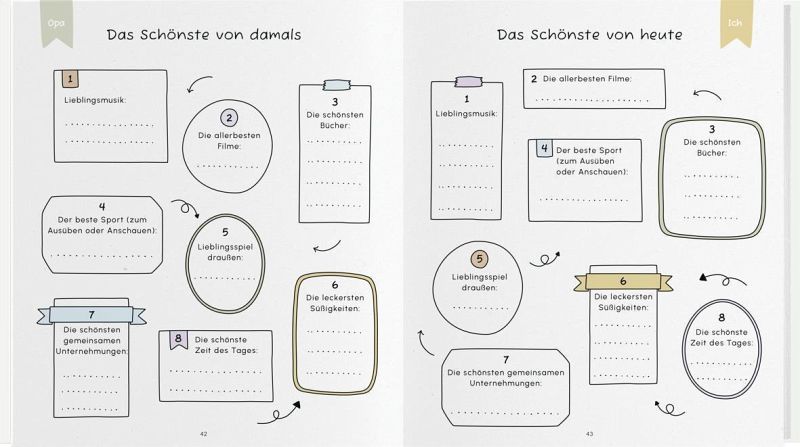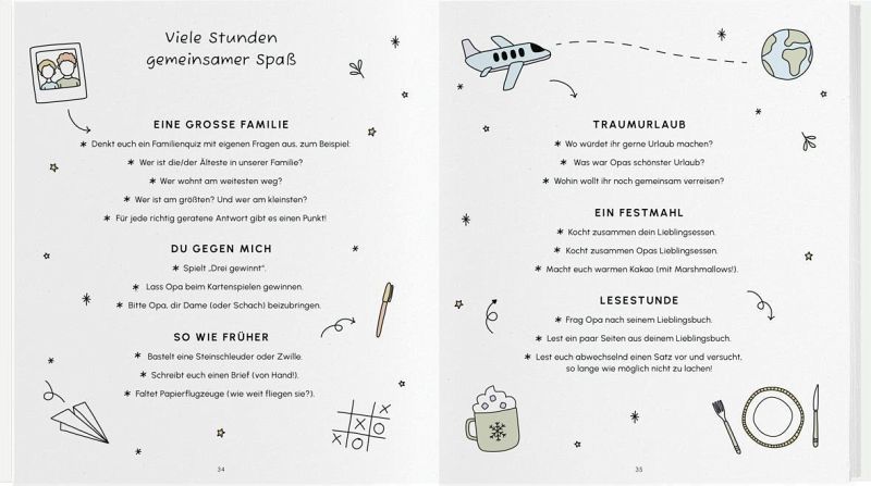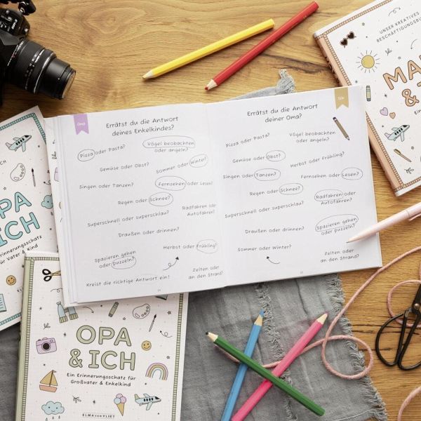 Entdeckt gemeinsam, wie das perfekte Haustier für euch aussehen könnte, plant das ideale Fest oder schreibt eure Wünsche für die Zukunft auf. Mit jeder Seite, die ihr gemeinsam ausgefüllt, entsteht eine einzigartige Geschichte: eure Geschichte!