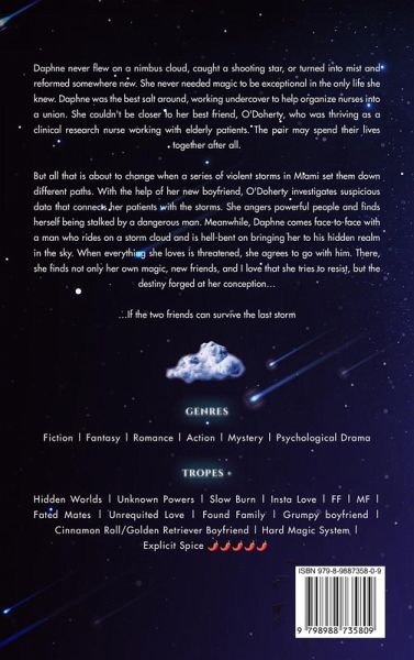 What happens when magically conjured tornadoes in Miami, Florida set two best friends-with-benefits down different paths? They fall into the arms of new lovers and dangerous adventures. Daphne is a travel nurse going undercover to help form a union at a local hospital. The last thing she expected was to be rescued from a tornado by a cloud-riding man with irises made of opals. After he hides her unconscious body in the woods, he stalks her until she agrees to come to his hidden sky kingdom. There, she discovers new friends, hidden powers, and a fate forged at her conception. O'doherty is a nurse conducting clinical research trials on elderly patients, who display the creepy behavior of sleepwalking in unison just before a tornado ravages their nursing home. With the help of her new computer hacker boyfriend, Fabian, she connects suspicious patient data to the recent string of strange storms and embarks on a dangerous investigation that angers powerful people. Pushing her luck despite the warning of a ghost, she finds herself being stalked by a menacing man hellbent on throwing her off their trail. That is until he decides to present her with an offer she has no choice but to accept. Daphne and O'Doherty's respective journeys come to a crossroads with the two having vastly different perspectives. With their friendship challenged they risk everything that they both worked so hard for. Leading with their love for each other, the two set into motion a series of events that will change their lives forever.