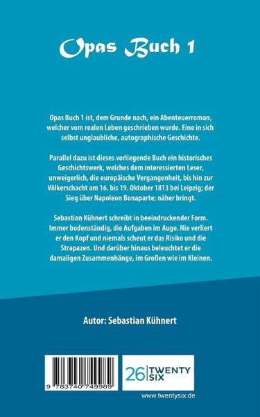 Opas Buch ist, dem Grunde nach, ein Abenteuerroman, der vom realen Leben geschrieben wurde.Eine in sich selbst unglaubliche, autographische Geschichte.Parallel dazu ist dieses vorliegende Buch ein historisches Geschichtsbuch, welches dem interessierten Leser, unweigerlich, die europäische Vergangenheit, bis hin zur Völkerschacht am 16. bis 19. Oktober 1813 bei Leipzig; der Sieg über Napoleon Bonaparte; näher bringt.Auch rückt es den Stand der Soldaten in sein, entsprechendes, gutes, Licht. Sebastian Kühnert schreibt in beeindruckender Form. Immer bodenständig, die Aufgaben im Auge, nie verliert er den Kopf und niemals scheut er das Risiko und die Strapazen. Und darüber hinaus beleuchtet er die damaligen, aktuellen Zusammenhänge, im Großen wie im Kleinen.