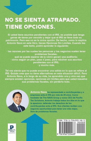 NO SE SIENTA ATRAPADO. TIENE OPCIONES. Si usted tiene asuntos pendientes con el IRS, es posible que tenga ganas de darse por vencido y dejar que el IRS se lleve todo su patrimonio. Pero esa no es la única opción. De hecho, como lo explica Antonio Nava en este libro, tienes Opciones Sin Límites. Cuando lea este texto, podrá aprender lo siguiente: las razones por las cuales las personas y los negocios suelen tener problemas fiscales; qué se puede esperar de (y cómo ganar) una auditoría; cómo seguir un plan, paso a paso, para resolver sus asuntos pendientes con el IRS; y mucho más. Tal vez sienta que no puede encontrar una salida en lo que se refiere al IRS. Quizás crea que no tiene alternativas en esta situación difícil. Pero Antonio Nava, a lo largo de su vida, ha aprendido una y otra vez que siempre existen opciones, opciones sin límites para que usted resuelva sus problemas fiscales, sin perderlo todo.