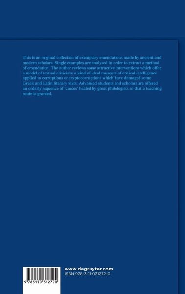 This is an original collection of exemplary emendations made by ancient and modern scholars. Single examples are analysed in order to extract a method of emendation. The author reviews some attractive interventions which offer a model of textual criticism: a kind of ideal museum of critical intelligence applied to corruptions or cryptocorruptions which have damaged some Greek and Latin literary texts. All Greek and Latin passages included are literally translated and commented step by step. Advanced students and scholars are offered an orderly sequence of 'cruces' healed by great philologists so that a teaching route is granted.