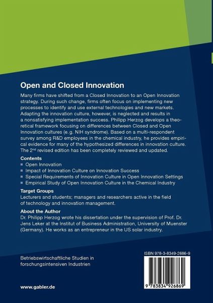 Philipp Herzog develops a theoretical framework arguing that Open Innovation and Closed Innovation cultures need to be different (e.g. regarding the not-invented-here (NIH) syndrome). Based on a multi-respondent survey among 120 R&D employees from three business units of a leading chemical firm, heprovides empirical evidence for many of the hypothesized differences in innovation culture. The findings may also help firms cope with the challenges experienced in implementing the Open Innovation concept.